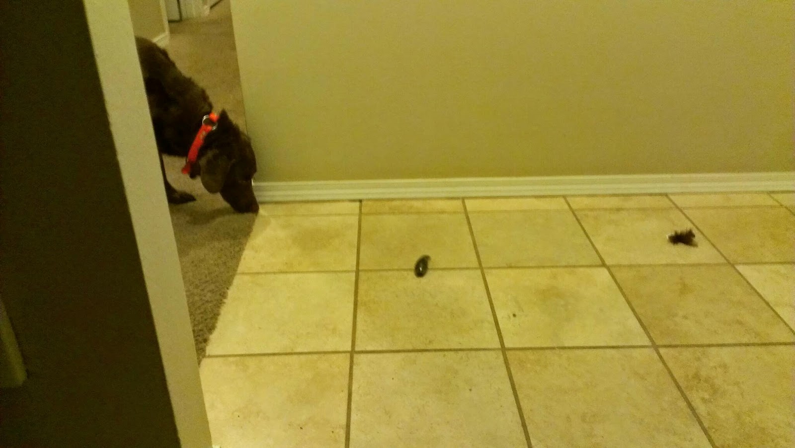 I bought goon some robot like bugs to chase around and Dallas took over chasing trying to bite and fling in the air and barking at them and was soo happy he had a new toy. Goon sat back and would bat the little bugs when they flew by.
